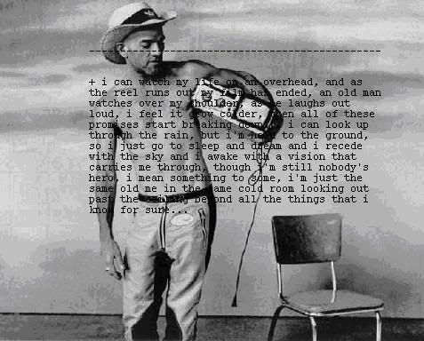 10/24/2005 Author's Note: + i can watch my life on an overhead, and as the reel runs out my film has ended, an old man watches over my shoulder, as he laughs out loud, i feel it grow colder, then all of these promises start breaking down... i can look up through the rain, but i'm held to the ground, so i just go to sleep and dream and i recede with the sky and i awake with a vision that carries me through, though i'm still nobody's hero, i mean something to some, i'm just the same old me in the same cold room looking out past the ceiling beyond all the things that i know for sure...
