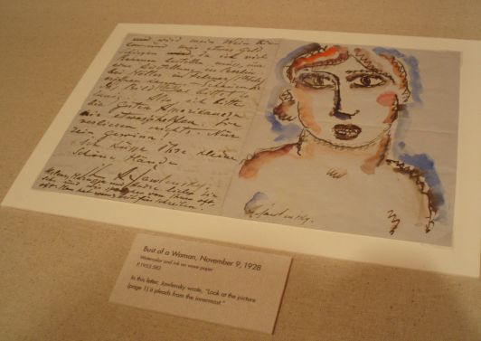 to his dear friend, Galka Scheyer, November 9, 1928. Under the watercolor "Bust of a Woman" that he painted into his letter, he wrote the words "look at the picture, it pleads from the innermost."