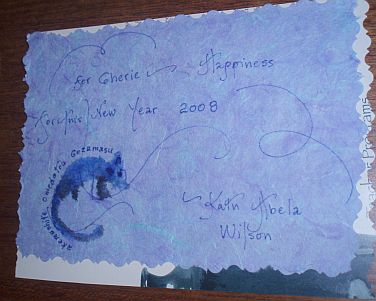 12/24/2007 Author's Note: This 2 of 60 original art works I am sending as part of a group from 15 different countries, following an old tradition from Japan by sending a New Year's greeting card called a Nengajyou [or nengajô] to haiku friends who signed up to participate. One can use a purchased postcard – or one you design yourself. In this case I am painting original and writing a response haiku for each poet, as they send them to me. Somewhere on the card, one includes the jyunishi (zodiac sign) for 2008 (the year of the rat) and the words *Akemashite Omedetou Gozaimasu* (Happy New Year).