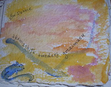12/25/2007 Author's Note: #5 of 60 in my series of personal artworks and haiku in response to haiku poets following an old tradition from Japan by sending a New Year's greeting card called a Nengajyou [or nengajô] to haiku friends who signed up to participate. One is free to use a purchased postcard – or one you design yourself. Somewhere on the card, we include the jyunishi (zodiac sign) for 2008 (the year of the rat) and the words *Akemashite Omedetou Gozaimasu* (Happy New Year). --mine are handmade and written each in response to the ones I receive. I might be late with some of these for New Year... but I think they will be appreciated. I love doing this.