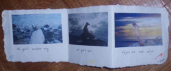 | Posted by Agnes Eva on 01/07/08 at 04:32 PM Oh yeah, I remember a call for participation on my haiku group for this tradition, but I had to decline due to baby needs this year. You are really making these lovely! I like this 'wooden cry' of the gull, very fascinating way of putting it. |