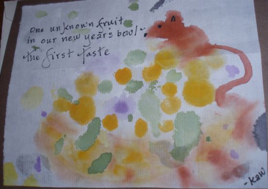| Posted by Agnes Eva on 01/07/08 at 04:25 PM dude, you are rockin the haiku. this is excellent. coupled with the artwork, it has the ring of mastership to it. I love the concept of a new year's bowl, first of all. Like it's a family tradition or something, I'm not sure if you made it up as a way of sneaking "new year" creatively into the bowl of fruit scenario, but no matter. And this sense of the unknown fruit and its mysterious taste and the unknown year ahead... brilliant! Good work. |