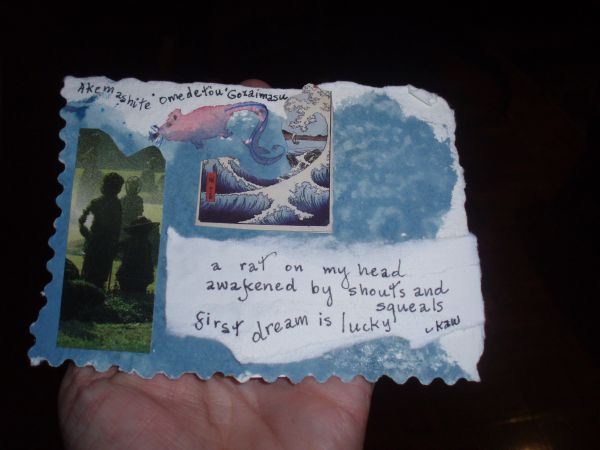 a rat on my head awakened by shouts and squeals first dream is lucky watercolor and ink, paper collage, on handmade paper by kathabela wilson