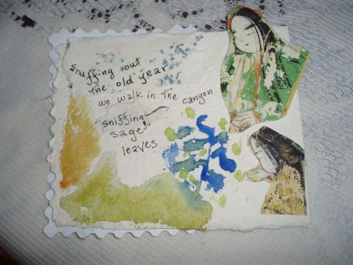 snuffing out the old year we walk in the canyon sniffing sage leaves watercolor and ink on handmade paper collage of Japanese prints by kathabela wilson